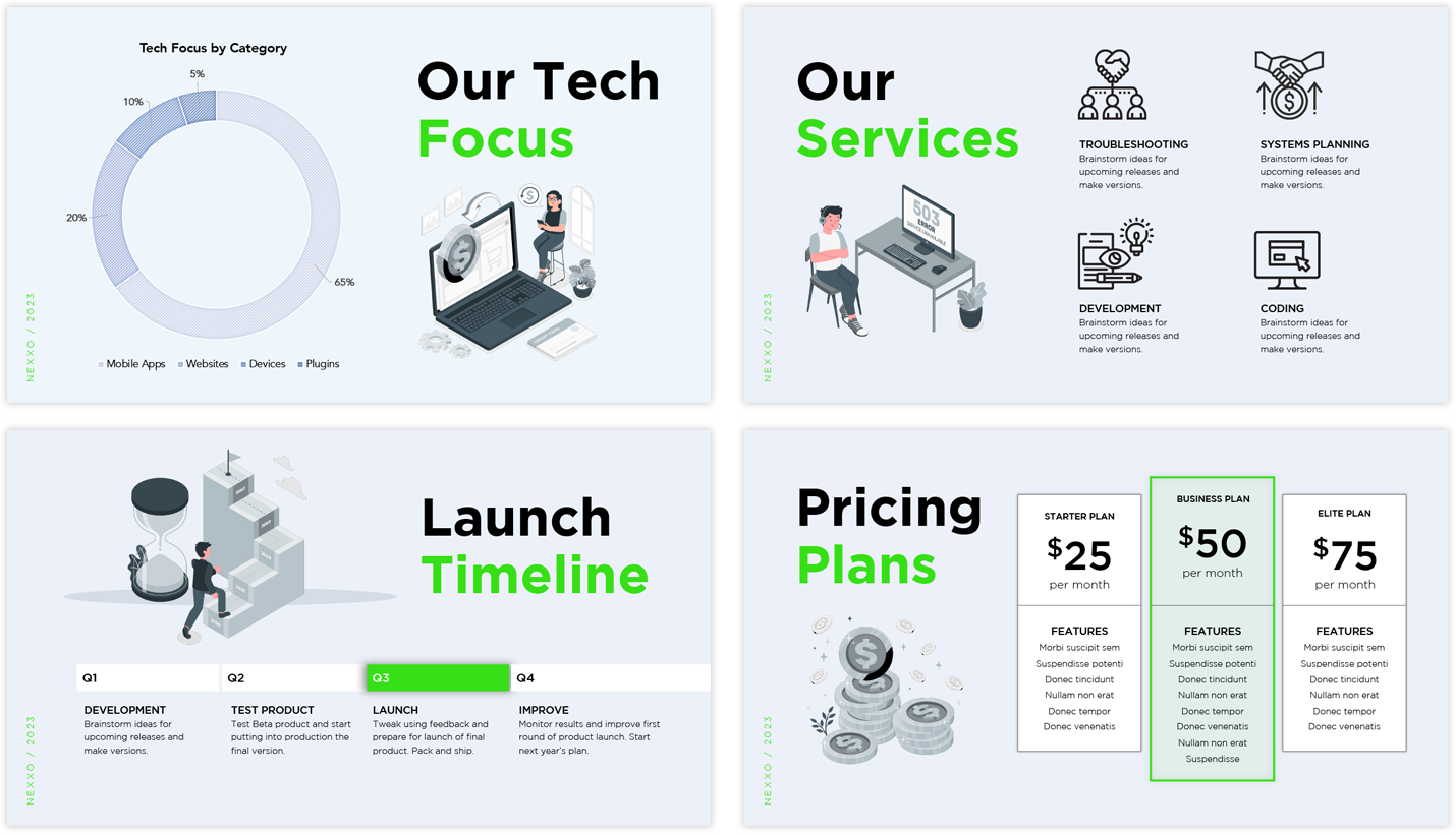 Microsoft PowerPoint is the most common software to use. I can also work in Google Slides or Keynote at your request. In combination, I also use Adobe software to create more complex design elements.